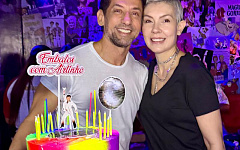 Amigos queridos, Diego Gomes e Nalu Jane fazem pausa para registro ao lado do dono da festa